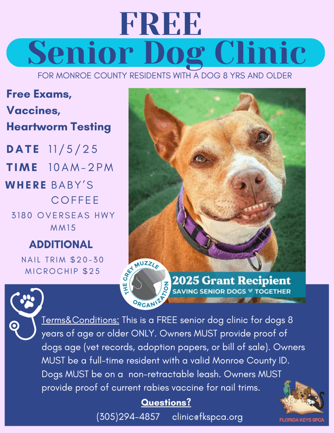 Thanks to The Grey Muzzle Organization, we’re excited to offer a FREE Senior Dog Clinic for Monroe County Residents on November 5 from 10am-2pm at Baby’s Coffee