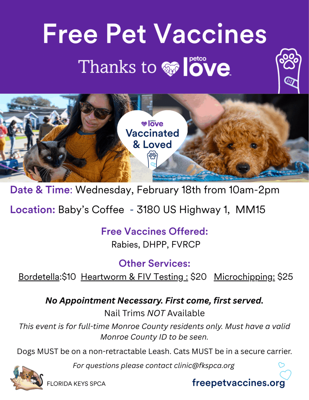 We’ve partnered with Petco Love to bring this special clinic to Monroe County residents as part of their Vaccinated and Loved campaign. Help protect your furry family members with vaccines that prevent serious illnesses.