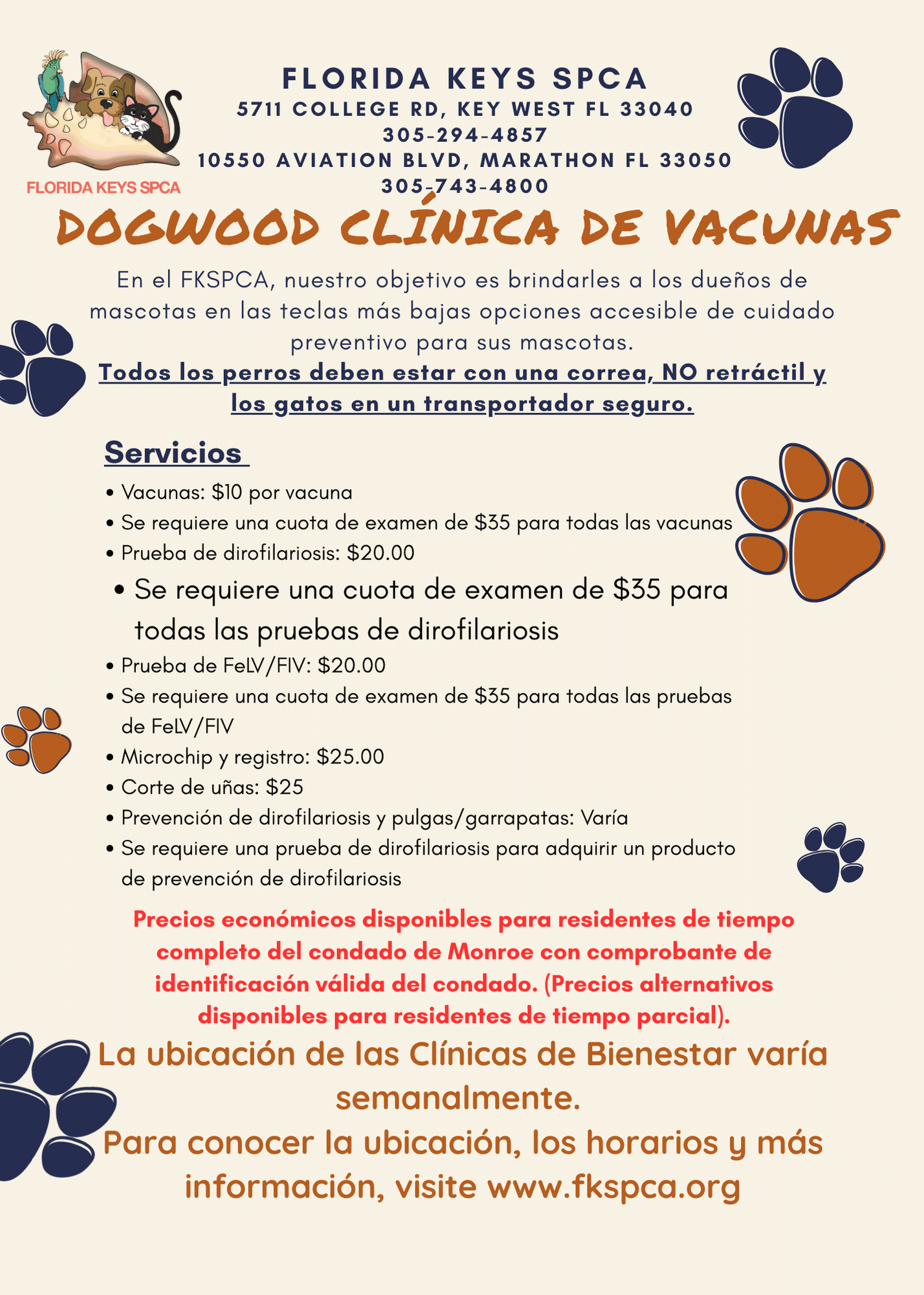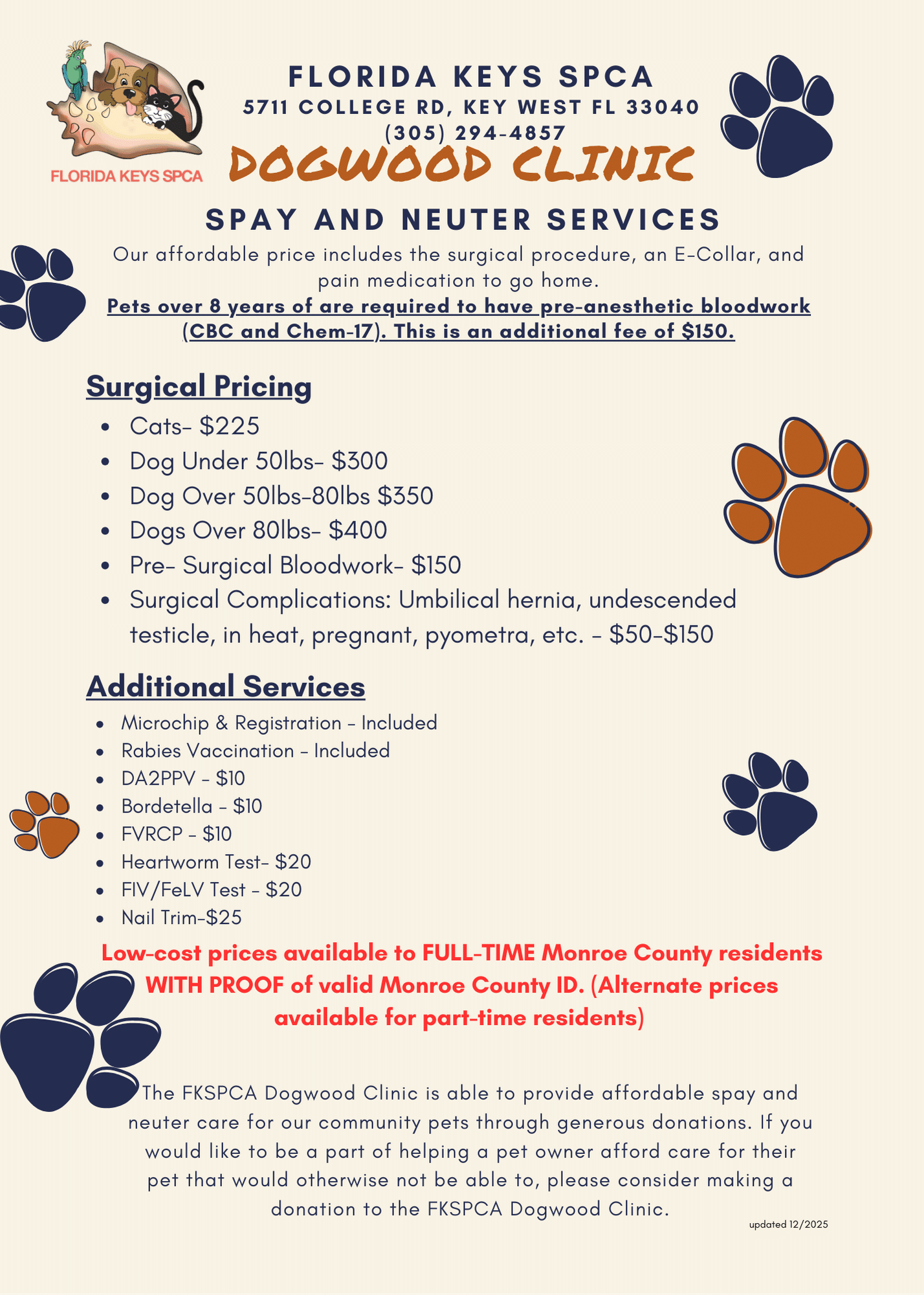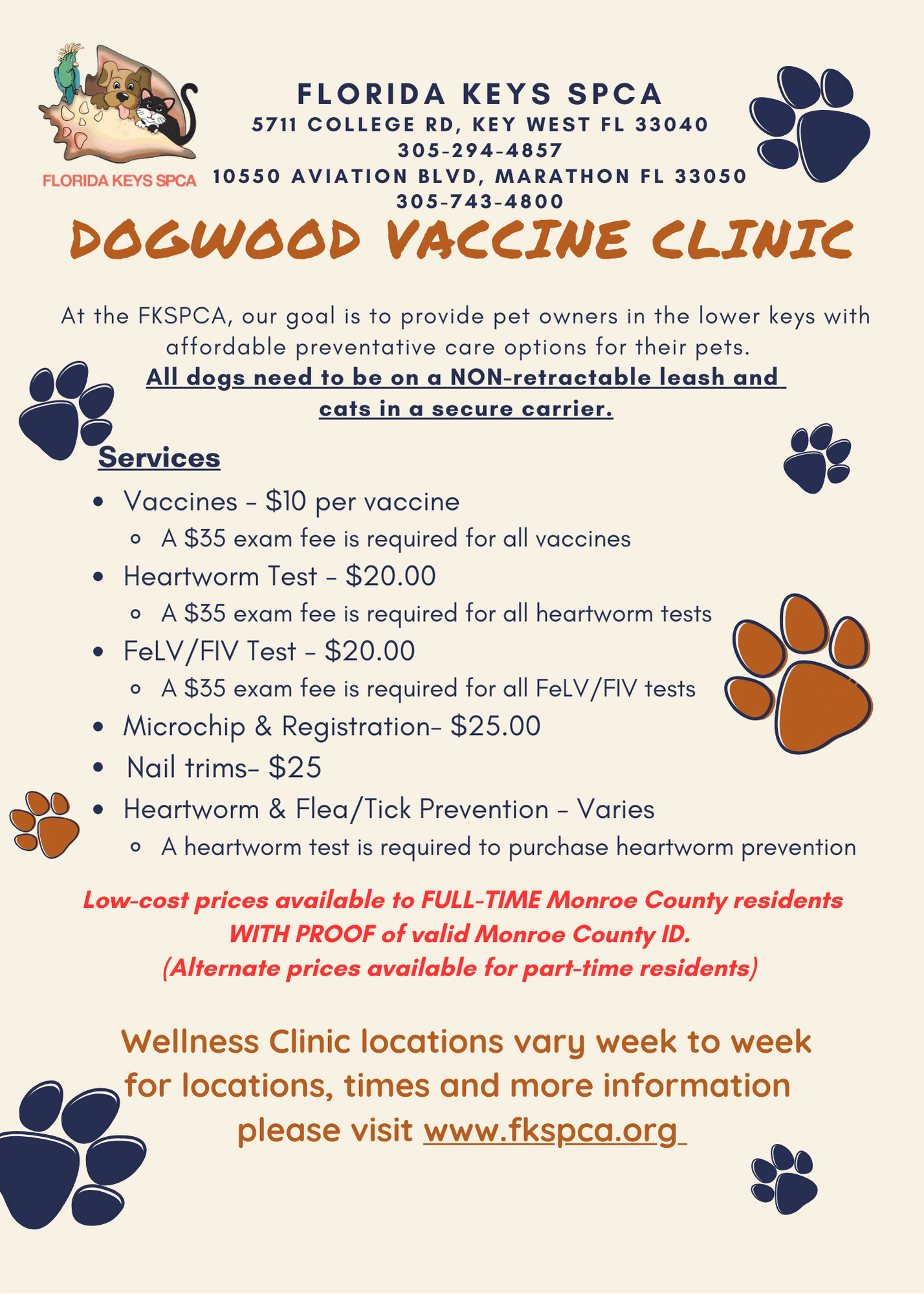 Please contact the Dogwood Clinic directly at 305.294.4857 or by email at Clinic@fkspca.org with any questions.